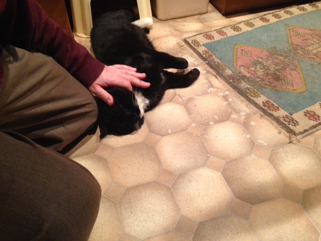 We lost Sylvester today. Sylvester is a semi-feral tom cat who first appeared about 3 years ago. Initially he would just dart in through the cat-flap late at night and scarf down the food we’d left for Tigger and other visitors. You couldn’t touch him, but he seemed to like me sitting about six feet away and singing quietly to him. After two years or so of this I thought I’d try to tame him. I started getting closer to him and about six months ago stroked him for the first time. He liked it. After a few weeks of tentative handling he started to follow me & butt his head against my hand. One day I heard a rusty rumble: Sylvester, after perhaps a decade in the wild, had remembered from his kittenhood how to purr.